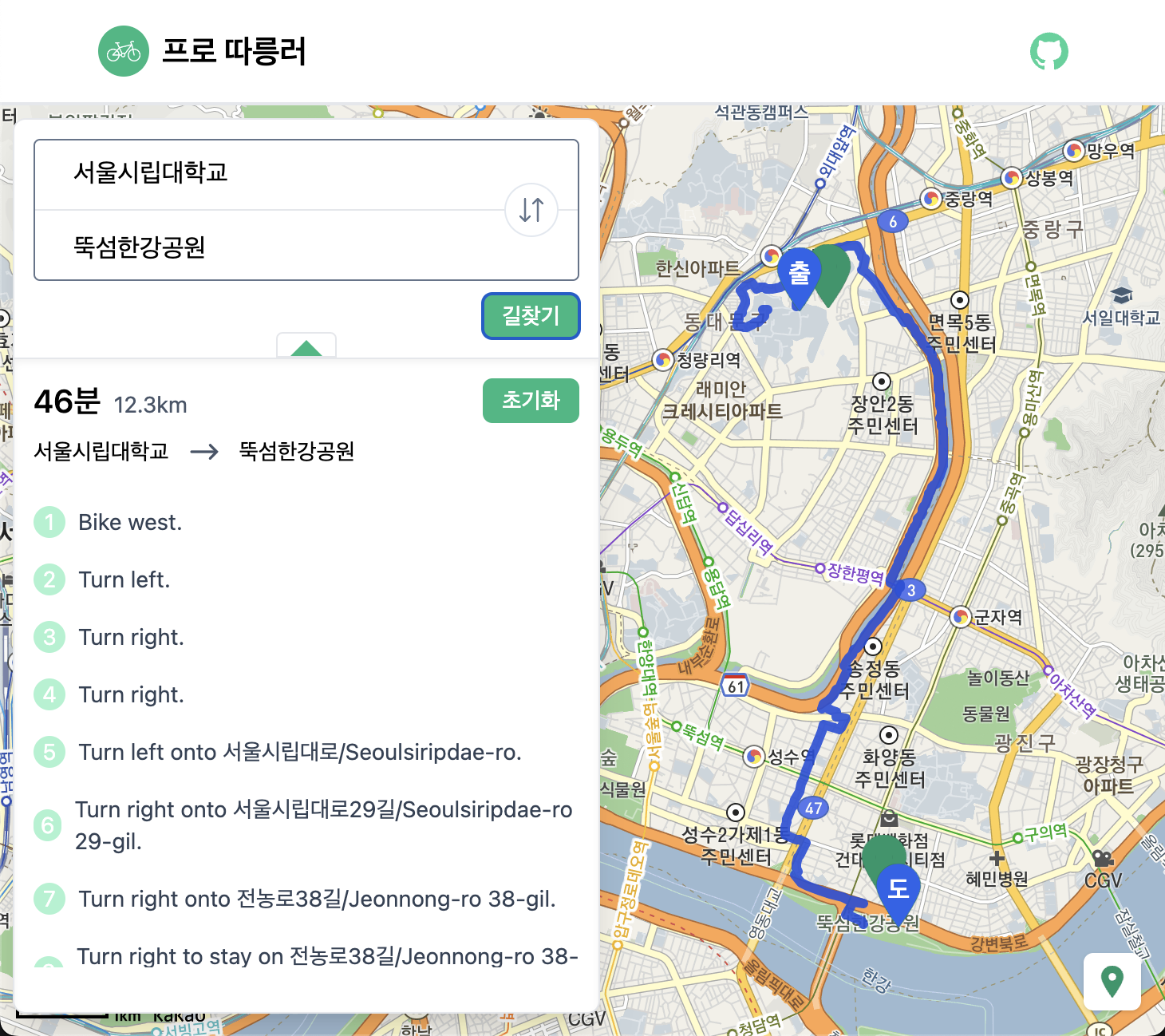 현재 사용자가 따릉이를 이용할 때 경로 탐색 과정을 살펴보면 다음과 같습니다.