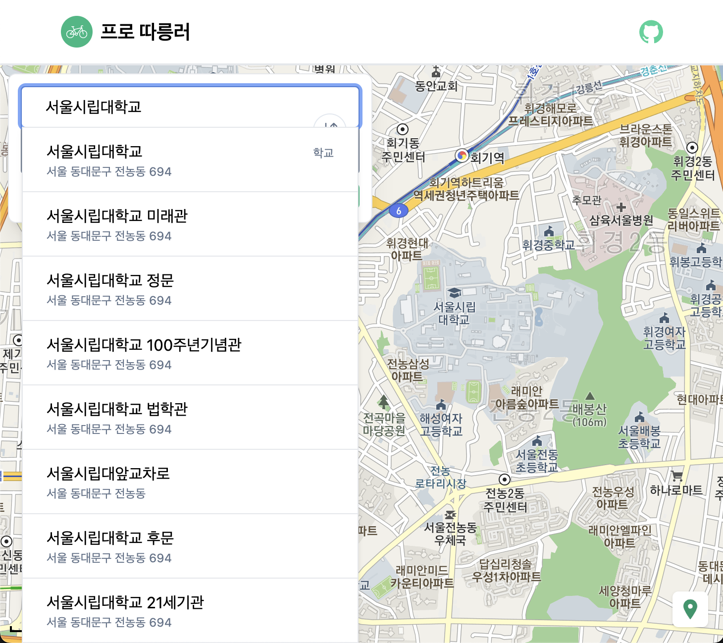 - 위치 검색: 키워드로 원하는 위치를 검색할 수 있습니다. 따릉이는 서울시 사업으로 범위가 한정되어 있기 때문에 검색 범위는 서울로 제한했습니다.