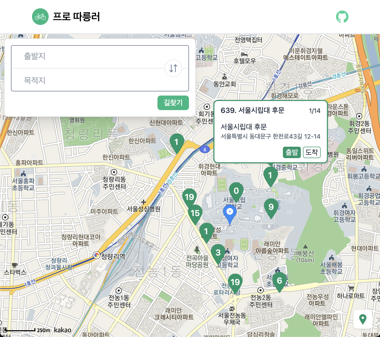 프로따릉러는 따릉이 전용 경로 추천 시스템입니다. 따릉이 대여소 정보를 제공하며 경로 탐색 시 출발지와 목적지 주변 대여소를 기반으로 경로를 추천해줍니다.