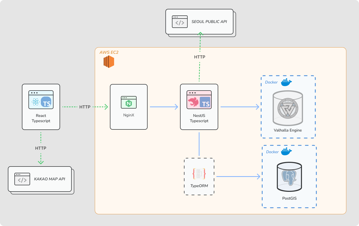 - 라우팅 엔진(경로 탐색 엔진)은 오픈소스 Valhalla 엔진을 사용했습니다.