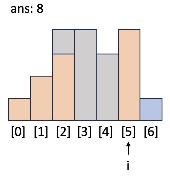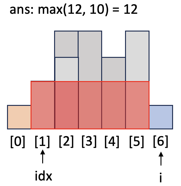 i = 6일 때 while 문을 돌며 `h`보다 작거나 같은 막대가 나올 때까지 넓이를 계산합니다. `idx`가 1이 되어서야 `h`와 같은 높이가 막대([0])를 발견하고 while문이 종료됩니다. `top`인 [0]과 `h`의 높이가 같으므로 `h`는 버립니다.