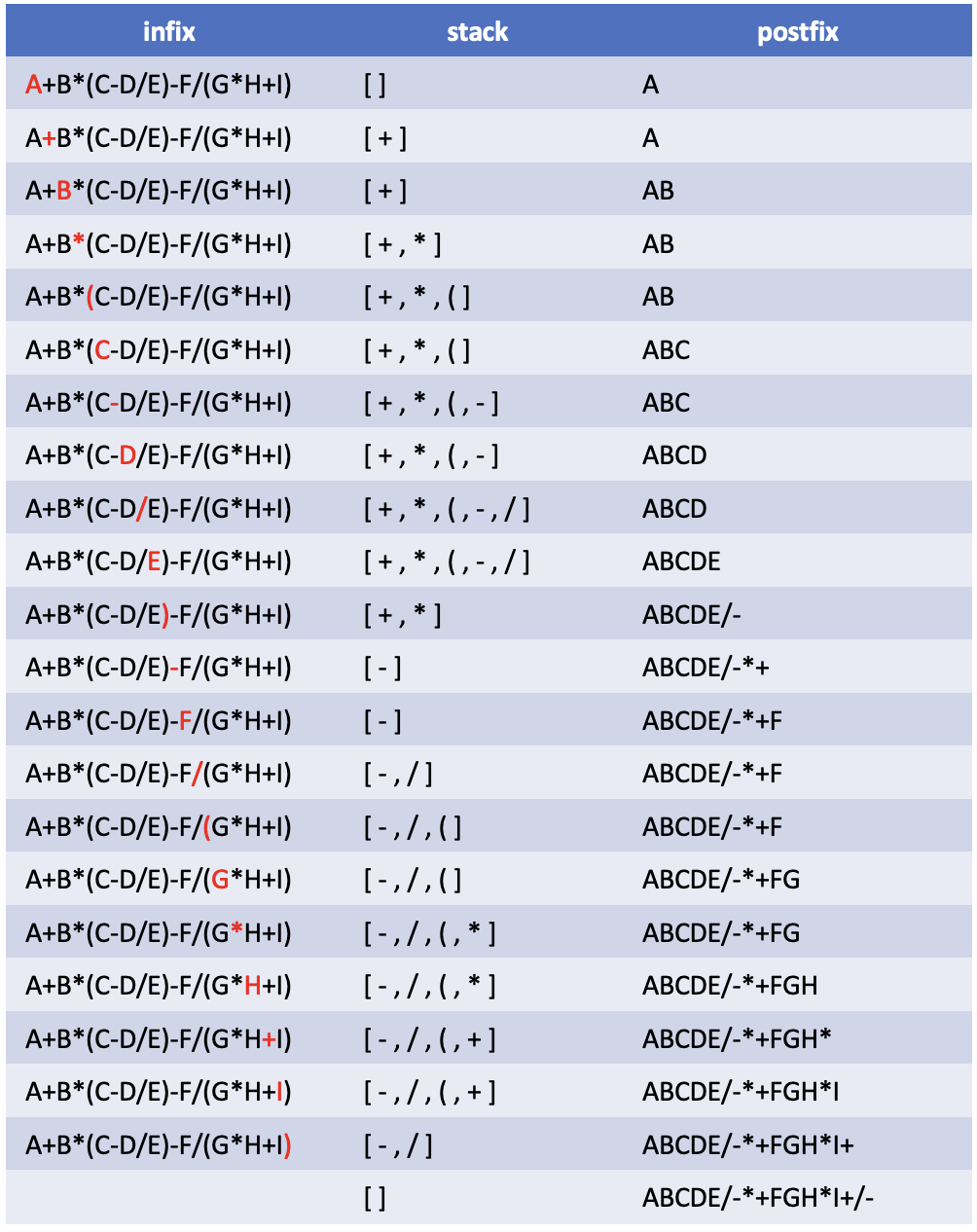 예를 들어 a+b*c는 (a+(b*c))의 식과 같게 된다. 그 다음에 안에 있는 괄호의 연산자 *를 괄호 밖으로 꺼내게 되면 (a+bc*)가 된다. 마지막으로 또 +를 괄호의 오른쪽으로 고치면 abc*+가 되게 된다.