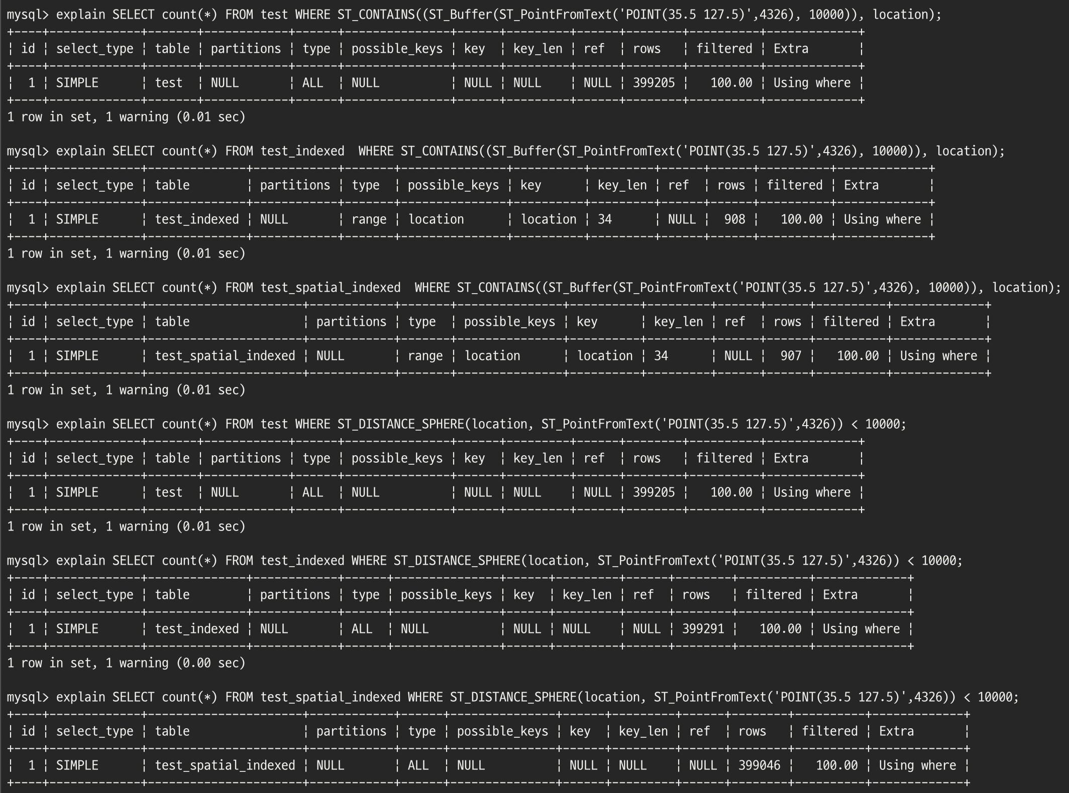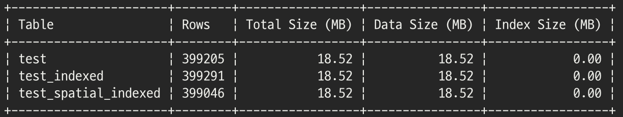 비교를 위해 인덱스가 없는 경우(test 테이블), 비공간 인덱스가 있는 경우(test_indexed 테이블), 공간 인덱스가 있는 경우(test_spatial_indexed 테이블)을 생성합니다.