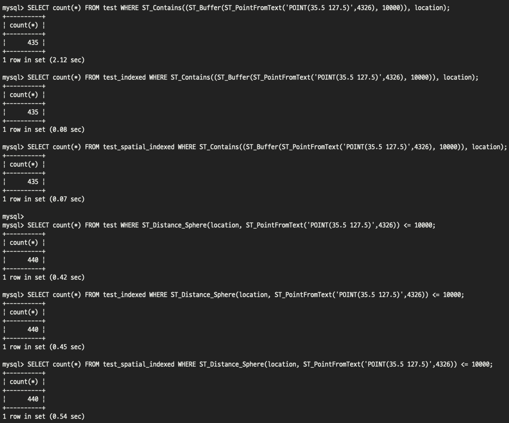 `ST_Distance_Sphere()`는 인덱스의 영향을 받지 않고 모두 0.4 ~ 0.5초 대이며 인덱스를 사용하지 않은 테이블에서 `ST_Buffer()`가 2초 대로 가장 느렸습니다.