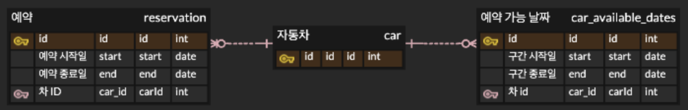 가장 먼저 떠올릴 수 있는 ERD라고 생각합니다. 그럼에도 가장 나중에 고려했던 이유는 위 ERD의 경우 예약 가능 차량을 조회하기 위해 테이블 3개를 join해야 하기 때문입니다. 앞서 살펴본 테이블 관계들은 join을 한 번으로 줄일 수 있었기에 먼저 고려했지만 여러 이유로 돌고 돌아 가장 간단한 방법으로 회귀했습니다. Simple is the best!!