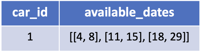 JSON 타입을 이용해 예약 가능 기간을 구간 형식으로 저장하면 저장된 모습과 SQL 쿼리는 아래와 같습니다.