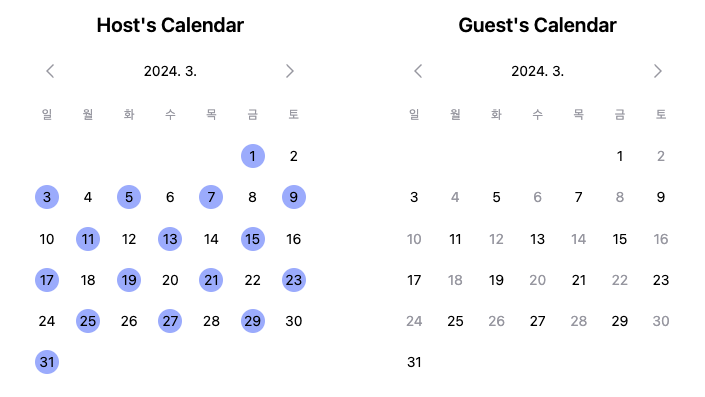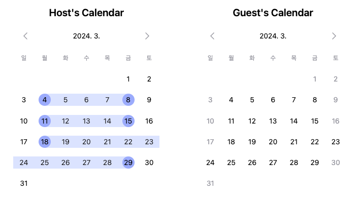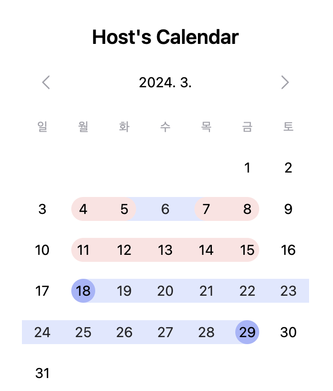다음과 같이 `예약 가능 날짜`와 `예약`이 있다면 호스트 캘린더에는 위와 같은 모습으로 표시될 것입니다.