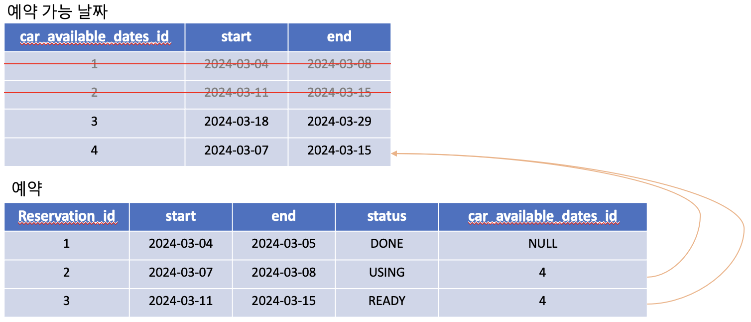 합쳐지는 두 구간에 해당하는 레코드를 삭제하고 새로운 레코드를 추가한다면 위와 같은 모습으로 저장될 것입니다. 이때 예약 테이블의 FK(Reservation.car_available_dates_id)가 변경되며 심지어 어떤 예약들은 FK를 잃어버리게 됩니다.