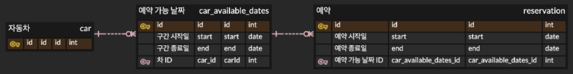 저희는 JSON으로 저장하는 방법을 거쳐 최종적으로 마지막 방법(`예약` - `자동차` - `예약 가능 날짜`)으로 데이터베이스를 설계했습니다. 프로젝트 중간에 데이터베이스를 변경하며 많은 API를 수정하고 테스트 코드를 날려먹었지만 좋은 경험이었다고 생각합니다.