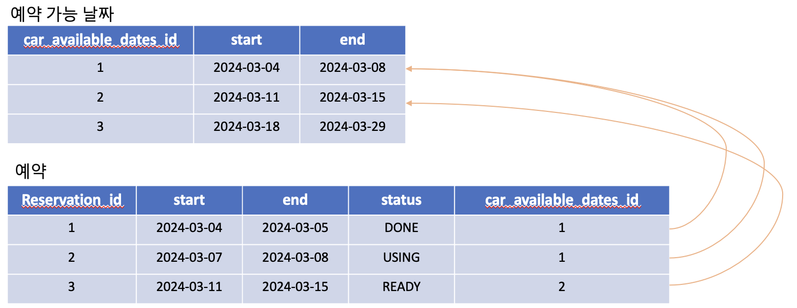 예약은 예약 가능 기간 중 하나의 구간에 완전히 포함되어 있으므로 예약 가능 기간과 예약은 일대다 관계로 표현될 수 있습니다. 이 경우 예약 생성, 수정, 예약 가능 차량 조회 시 car와 join하지 않아도 됩니다.