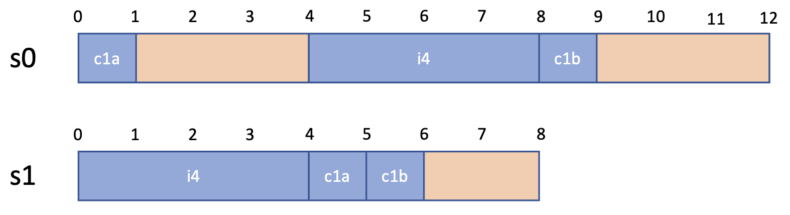 같은 내용의 두 개의 구조체 `s0`와 `s1`을 만들었지만 둘의 크기는 각각 12 bytes와 8 bytes로 차이 납니다. 컴파일러는 위 규칙에 맞도록 저장하기 위해서는 데이터 사이에 패딩을 넣습니다. 따라서 실제 저장되는 모습은 아래와 같을 것입니다.