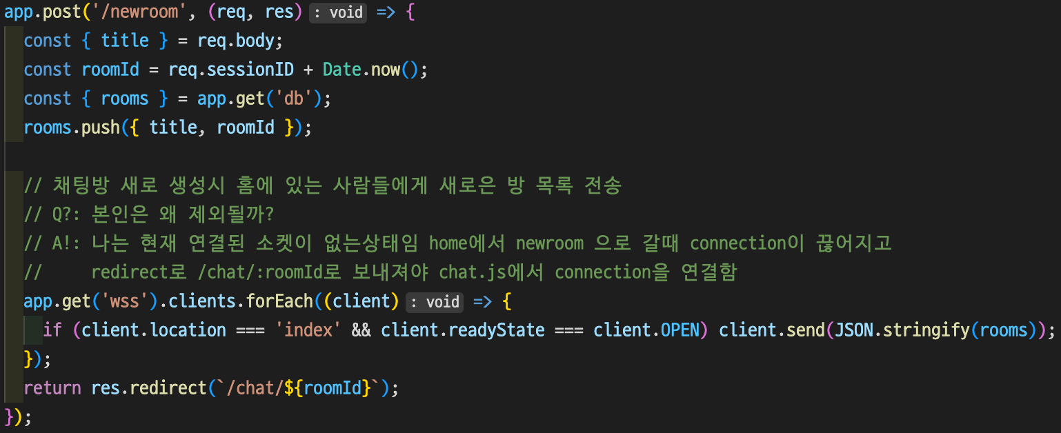 채팅방이 새로 생성될 때 새로 생성된 방을 index페이지에 있는 커넥션이 연결된 소켓들에 전송해줍니다. 처음 개발 시 console.log로 clients.forEach의 client를 출력했을 때 자기 자신이 나오지않아 wss에 연결된 소켓의 수가 하나 적어 의아했으나 생각해보니 자신은 wss와 소켓을 연결하고 있지 않았습니다.