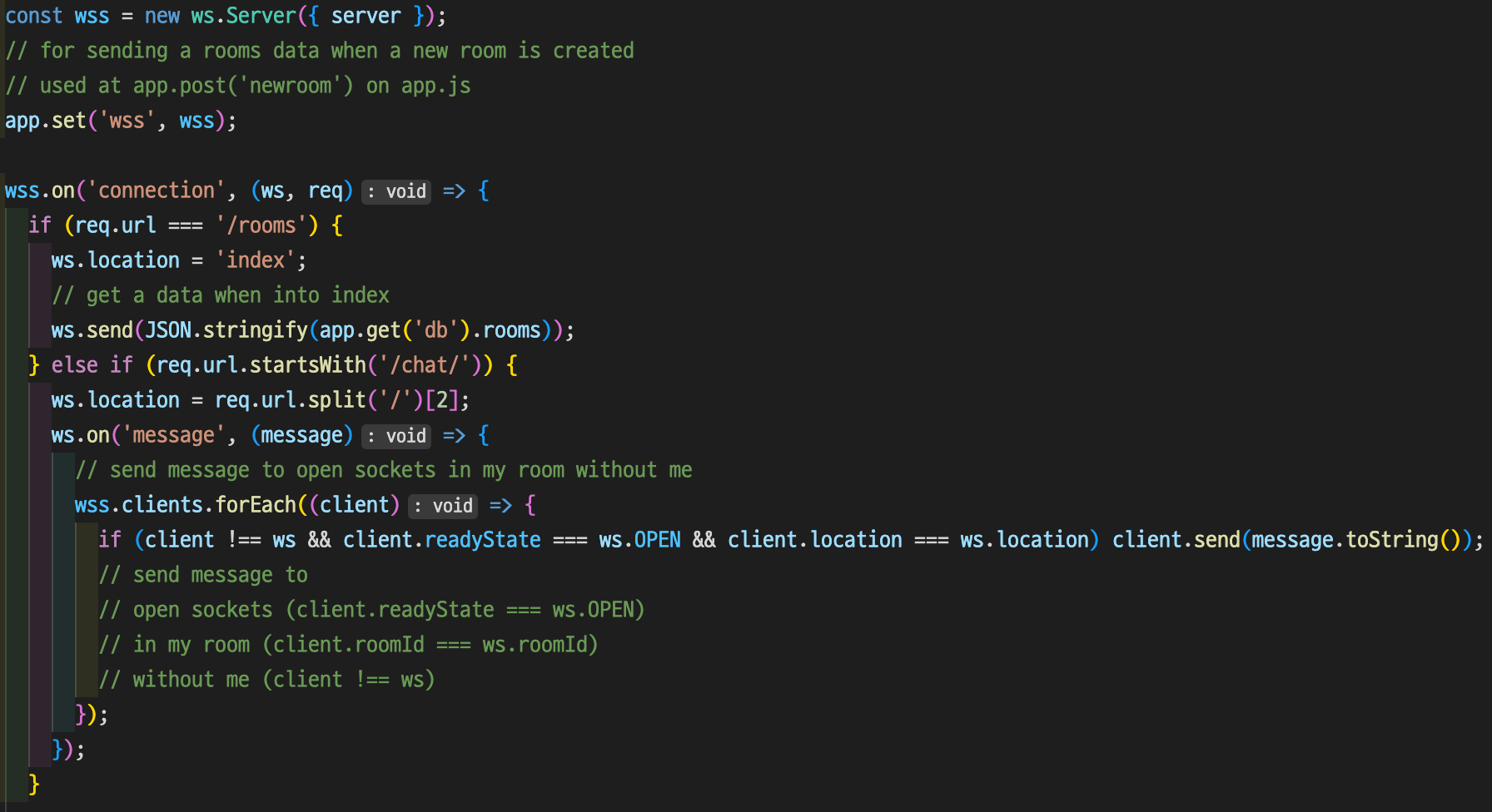 거창하게 말했지만 사실 별건 없습니다. 제가 생각한 방법은 이렇습니다. 먼저 ws프로토콜의 uri를 이용하여 주고받는 데이터에 따라 소켓의 종류를 분류합니다(웹소켓 서버를 api서버로 사용합니다.). ws:localhost:8003/rooms로 연결된 소켓은 실시간 생성된 방 정보를 주고받는 소켓, ws:localhost:8003/chat/:roomId로 연결된 소켓은 실시간 채팅을 주고 받는 소켓으로 분류합니다. 그 뒤 데이터를 전송할 때 이들을 구분하기 위해 소켓에 locaiton프로퍼티를 생성해 소켓이 어디에 속했는지를 알 수 있도록 그루핑 했습니다. 데이터가 wss로 들어오면 uri에 의해 wss에서 전송하는 데이터 내용이 달라지고 wss의 모든 소켓의 location을 조회해 전송하는 소켓이 달라지는 방식입니다.