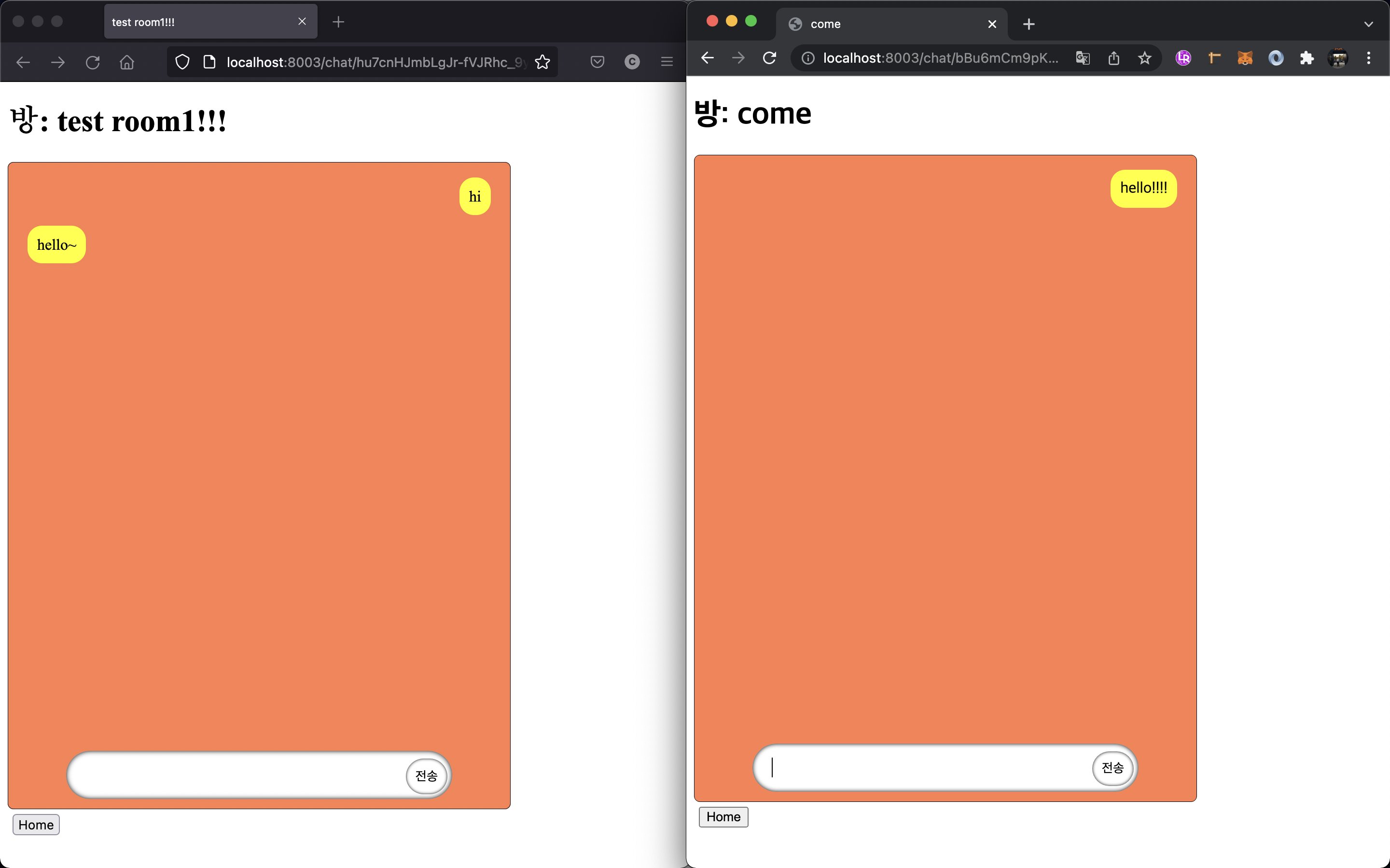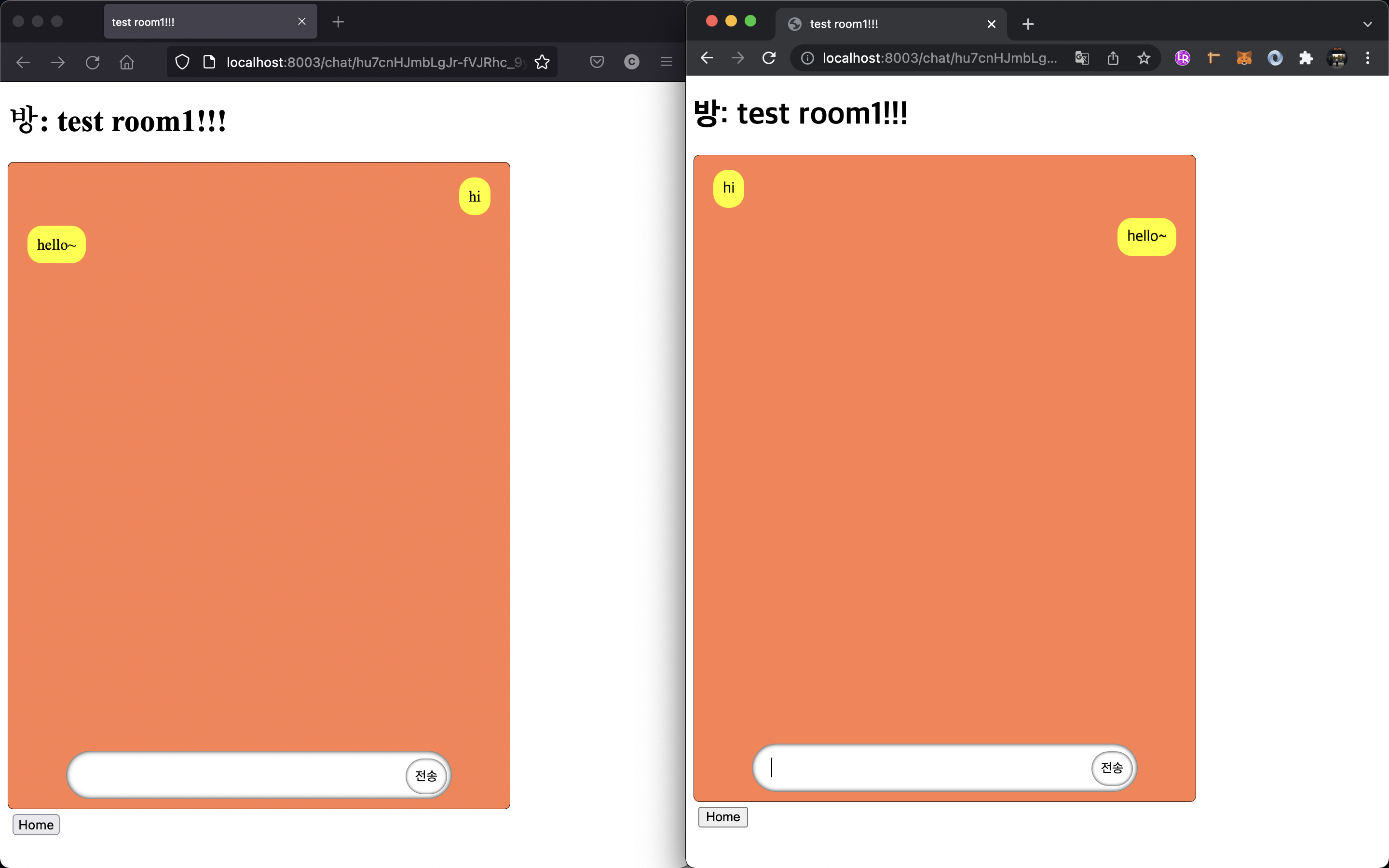 다른 채팅방을 생성해 메시지를 보내보면 같은 채팅방에 있는 사람끼리만 소통할 수 있는 것을 확인할 수 있습니다.