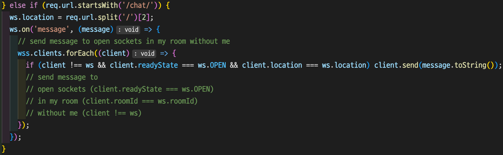 /chat/:roomId로 커넥션이 연결되면 location에 roomId를 부여하고 소켓에 메시지 이벤트를 등록합니다. 소켓을 통해 메시지가 오면 자신을 제외하고 같은 채팅방 안의 커넥션이 열려있는 소켓들에게 메시지를 전달합니다.