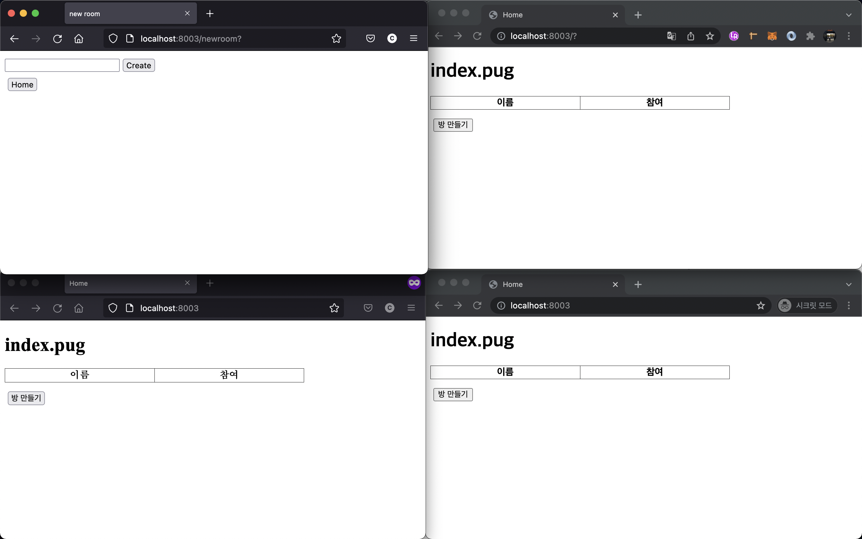 파이어폭스, 크롬으로 보통 창과 시크릿 창을 열어 총 4명의 client로 테스트해보았습니다.