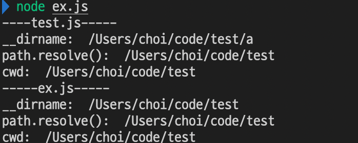 path.resolve()와 process.cwd()는 ex.js의 경로를 나타내고 있다. 즉 entry point 파일의 directory 경로다.