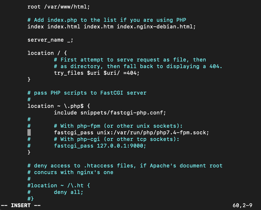 /etc/nginx/sites-available/default 파일을 수정해 php-fpm과 연결해준다.