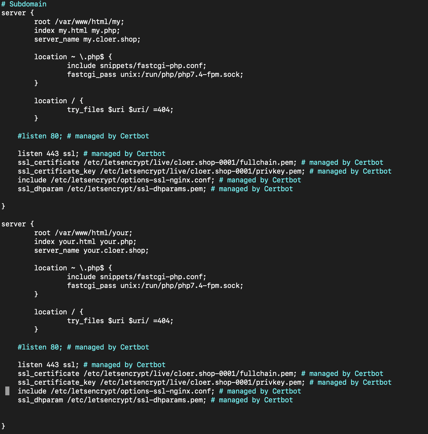 managed by Certot 부분은 이 글 후반부에 서브 도메인에 https인증을 받을때 자동으로 생긴 것이므로 무시하고 server{ root 부터 location} 까지만 my와 your에대해 두개 작성해준다.